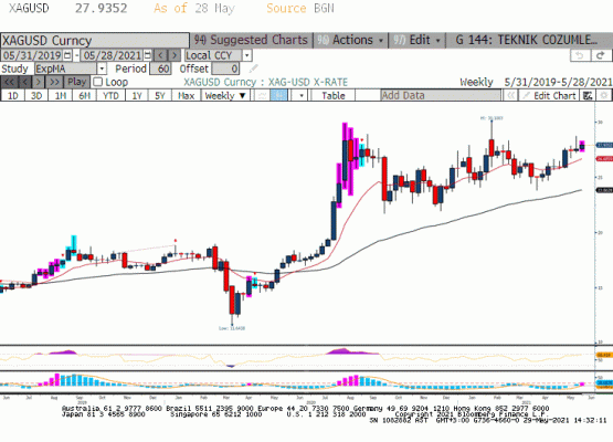 21 Mayıs haftasında Dolar Endeksi ve tahvil faiz oranlarındaki düşüş ile piyasaların risk alma eğilimi gümüş fiyatlarının 28.75 dolara yükselmesini sağladı. 27 Mayıs haftasının yüksek seviyesi ise 28.23 dolar ve gümüş haftalık grafikte bollinger üst bant ile olan mücadelesinde başarılı olamamış görünüyor. XAGUSD paritesi 28.25 üzerinde kapanışlar ile 29.15 dolara doğru yükselişini sürdürebilir. Öte yanda son haftalarda endüstriyel metal piyasasında görülen aşağı yönlü düzeltmeler ile gümüşün altına kıyasla emtia piyasasındaki hareketlere hassas olduğu söylenebilir. Altın/gümüş rasyosu 68.50 seviyesinde ve son 9 günde altın EFT’lerine giriş sürerken sene başından bu yana net te girişlerin olduğu gümüşte bir 28.00 dolar üzerindeki fiyatlama ile bir miktar çıkış örüldü. Kısa mevcut piyasa fiyatlamaları içinde gümüş fiyatlarının 28.00 dolar üzerine yerleşmekte zorlandığını ancak 27.35 dolar üzerinde kaldığı sürece yükseliş denemeleri olacağını söyleyebiliriz.