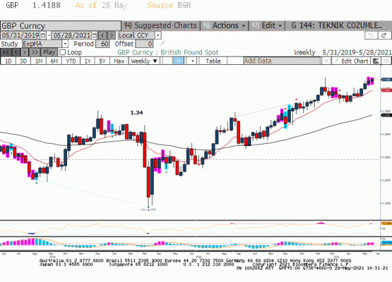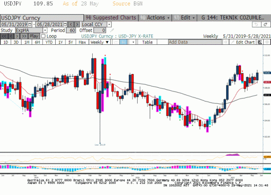 Hızlı aşılama sonrası İngiltere ekonomisinde ağırlığı yüksek olan servis sektörünün ekonomik büyüme katkısı ile Sterlin 21 Mayıs haftasında en yüksek 1.4234 seviyesini gördü. Bloomberg tahminlerine göre İngiltere ekonomisi yılın ikinci çeyreğinde %6 3. Çeyreğinde %2.5 GSYIH artışını yakalayabilir. Bu senaryo gerçekleşir ise İngiltere ekonomisi 2021 yılı son çeyrekte pandemi öncesi ekonomik büyüklüğe ulaşmış olacak. Ancak Euro/dolar paritesinde olduğu gibi İngiliz Sterlininin de 1.4250 üzerine geçmekte zorlandığını görüyoruz. FED ’in yükselen enflasyon ile önümüzdeki toplantılarda varlık alımlarını tartışabileceği beklentisi Dolar Endeksi’nin daha düşük seviyeleri görmesine engel oluyor. Öte yanda geçtiğimiz hafta Hindistan mut andının kontrol altına alınması konusuna ilişkin endişeler ve İngiliz hükümetin ekonomik açılma kabiliyetinin sorgulanması para birimi üzerinde baskı oluşturdu. Bunun yanında İskoçya’nın pandemi sonrasında bağımsız referandum planladığı yönünde haber akışının da Sterlin negatif olduğunu söyleyebiliriz. Teknik olarak, 1.4100 altında kapanışlar ile Sterlin 1.4000 civarında olan 9 günlük üssel hareketli ortalamasına doğru geri çekilmek isteyebilir.