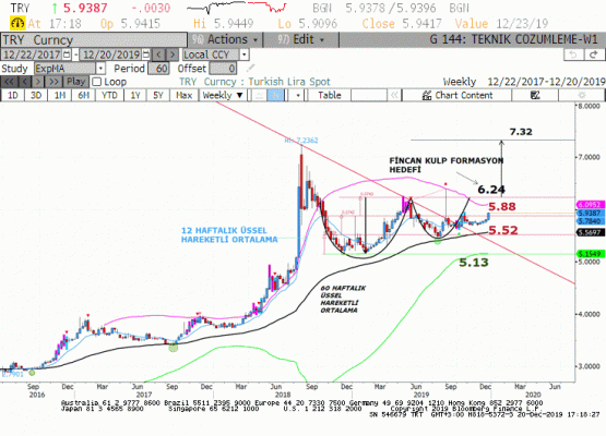Haftalık bazda önem arz eden 5.9380 (barış pınarı harekatı zirvesi) seviyesi üzerinde kalıcılık sağlanırsa fincan-kulp formasyon hedefi 6.24 teknik hedef olabilir. Ancak CDS ve Dolar Endeksi hareketi kurda yükselişi desteklemiyor. Bu nedenle kuvvetli bir yükseliş trendi beklemiyoruz. Aşağıda destek konumuna geçen 5.8448 kırılırsa ciddi bir rahatlama görülecektir.