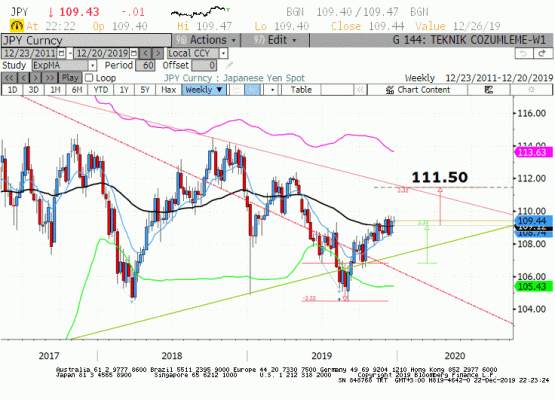 Teknik olarak 2018 yılından gelen alçalan trend direnci ve 200 günlük üssel ortalamanın geçtiği 1.1180 seviyesi direnç olarak güncelliğini iki haftadır korurken, geçen hafta fiyat-momentum negatif uyuşmazlık sinyali önemli görünüyor. Dolayısıyla eğer 100 günlük ortalamanın geçtiği 1.11 altında fiyatlamalar devam ederse çift dip oluşumu görülen 1.10 seviyesine kadar satışlar devam edebilir. 1.10 seviyesi çok kritik bir destek olarak izlenmelidir. Yukarıda ise 1.1180-1..1200-1.1230 seviyeleri çok kritik dirençlerdir.