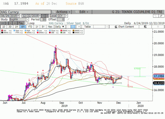 Eğer cuma günü oluşan 17.13 usd direnci üzerine kırılım bir boğa tuzağı değil ise daralan üçgen formasyon hedefi olan 17.91 usd seviyesine kadar hafta içinde yükseliş bekleriz. Ancak alınacak long pozisyonlarda 17.13 seviyesi altında stop loss kullanmak gerekebilir. Çünkü eğer 17.13 altına kırılım olursa cuma günü oluşan yükseliş bir boğa tuzağı niteliği kazanacak ve bu durumda piyasa ana destek seviyesi 200 günlük ortalama 16.61 seviyesine doğru gerileme gösterebilecektir. Haftalık bazda 16.61 kuvvetli destek 17.91 kuvvetli dirençtir.
