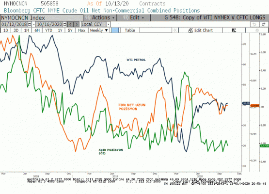 Petrol piyasasında analitik veriler; Fonların ve rapor edilmeyen küçük spekülatörlerin haftalık net uzun pozisyonları 6238 kontrat artarak 530125 kontrat oldu. Son dört haftada net uzun pozisyon miktarında artış 5515 kontrat iken vadeli piyasalarda ham petrol net uzun pozisyon miktarı 25 haftanın yüksek seviyesinde konumlanmış.