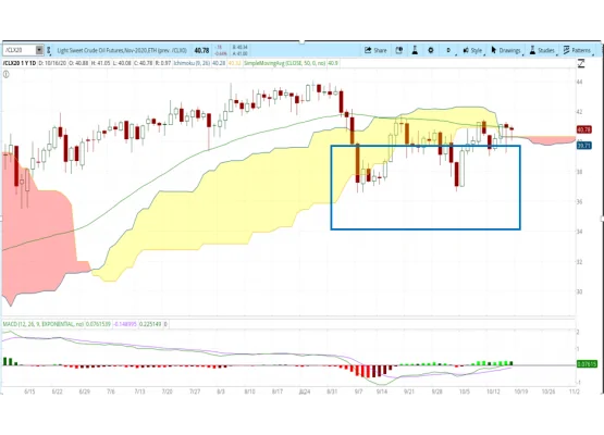 Teknik Analiz: Petrol biraz zemin kaybediyor ancak psikolojik olarak önemli olan 40.00 dolar seviyesinin üzerinde kalıyor. Kasım vadeli WTI Ham Petrol piyasası son bir aydan bu yana 41.75 - 42.00 dolar direnç seviyesini aşamıyor. 42.00-36.00 dolar arasında git gellerle zaman harcıyor. Grafikte, dikdörtgen ile vurgulanan yatay fiyat hareketi net şekilde 36.00 dolar destek ve 42.00 dolar direnç seviyelerini gösteriyor. Direnç ya da destek seviyelerinden birinin kırılması teknik olarak petrol fiyatının o yönde devam edeceği beklentisini oluşturur. Ancak, temel veriler de göze alındığında petrol fiyatlarında tekrar 36.00 dolara doğru satış baskısı ve zayıflamayı daha olası görüyorum. Kısa dönem göstergelerden MACD momentumu azalırken 50 günlük hareketli ortalaması önemli bir direnç olmaya devam ediyor.