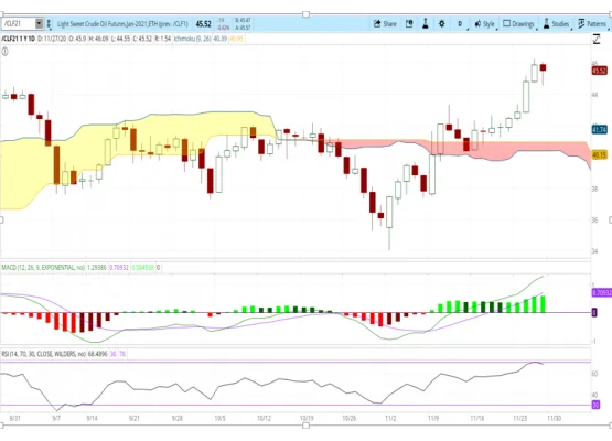 Teknik Analiz; Ocak vadeli WTI ham petrol fiyatı 43.00 dolar üzerinde yükselme momentumunu artırarak 45.00 dolar üzerine taşıdı. Hafta içinde aşılan önemli dirençler herhalde COVİD 19 aşı iyimserliği ve artması beklenen talebi satın almaya başladı. Yeni direnç, psikolojik 50.00 dolara taşındı ama unutulmasın petrol piyasasında aşırı volatilite kısa dönem beklentileri değiştirebilir. Kısa dönem göstergelerden Göreceli güç endeksinin (RSI) aşırı pahalı bölgede seyretmeye başlaması kar realizasyonunu tetikleyebilir.