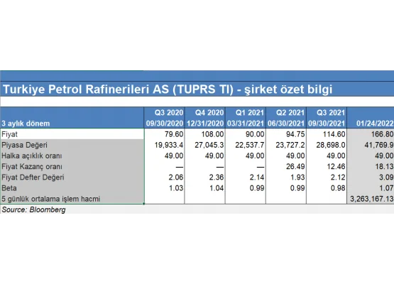 Globalde petrol talebi ve fiyatlarının yükselmesiyle, şirketin pandemi sürecinde yaşanan olumsuz bilançoları geride bıraktığını düşünmekteyiz. Ürün karlılıklarının yükselmesi bilançolara olumlu yansıyacaktır.2020 yılına göre 3. çeyrek itibariyle %117 oranında ciro artışı yaşandı, brüt karını ise bir önceki 6,44 katına çıkararak oldukça iyi bir yıl geçirdi.