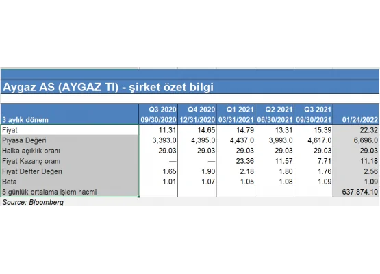 Şirket cirosunda 3. çeyrek itibariyle %41 artış göstermiş, faaliyet karında ise %90 oranında bir artış göstermiş durumda. Şirketin uluslararası büyüme stratejisi doğrultusunda yatırımları devam etmekte. 2022 yılı bilançosunda 2020 yılında yatırım yapılan Bangladeş pazarının da olumlu etkileri bekleniyor. Yükselen ham petrol fiyatlarının Aygaz’a olumlu etkisi olacaktır. Aynı zamanda Aygaz yüksek miktarda ve düzenli temettü dağıtımı yapar konumda bulunuyor.