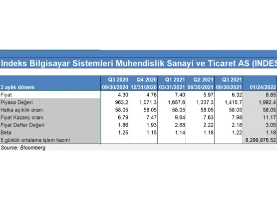 İndeks Bilgisayar Sistemleri: Şirket 2021 yılı 3. çeyrek itibariyle %28 ciro artışı sağlamış durumda, bu ciro artışını %36’lık artışla faaliyet karı artışı takip ediyor. Ülkemizdeki hızlı teknoloji gelişimine olan taleple birlikte şirketin büyümesinin devam edeceğini düşünüyoruz.