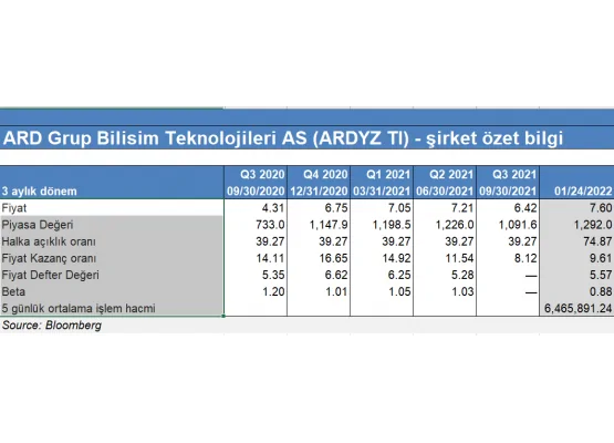 Şirket geçtiğimiz yılın 3. çeyreğine oranla %38 ciro artışı sağlamış durumda. Bu satışları brüt karına %44, net karına ise %100’e yakın bir oranla yansıtabilmiş durumda. Şirketin Romanya’daki iştiraki Total Soft tarafından, 2022 yılında getirilerin yükselmesini düşünüyoruz. 2022 yılında devletin e-dönüşüm kapsamındaki gelişmelerin devam edeceğini, bunun da şirketin satışlarına ve müşteri kazanımlarına pozitif yansımaya devam edeceğini düşünüyoruz.