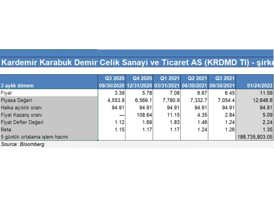 Karabük Demir Çelik Sanayi : Şirket 3. çeyrek itibariyle geçtiğimiz yıla oranla %94 oranında bir ciro artışı yaşadı. Bu oranı faaliyet karına ve satışlarına da yansıtan şirket iyi bir yıl yaşadı, beklentimiz 2022 yılının da şirket için iyi geçmesi yönünde.