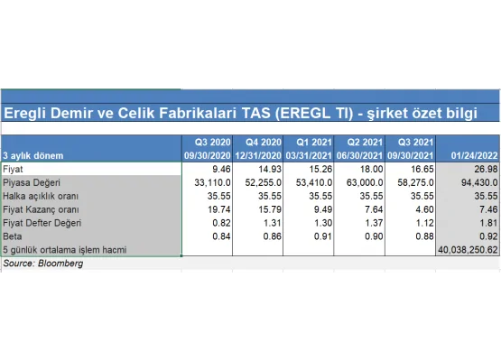 Ereğli Demir Çelik: Şirket 2021 yılı 9 aylık dönem itibariyle, geçtiğimiz yıl aynı döneme oranla %96 gibi etkileyici bir ciro artışı gerçekleştirdi. Bu oran faaliyet karına %356 gibi çok güçlü bir artış olarak yansıdı. Şirket geçtiğimiz yıla oranla %626 net kar artışı yaşayarak, tarihsel olarak en iyi dönemlerinden birini yaşadı.
