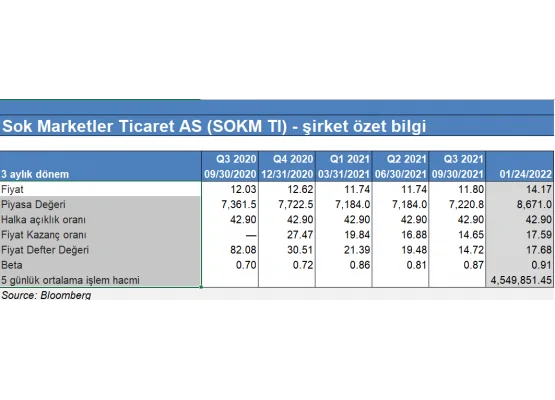 Şok Marketler Ticaret A.Ş: 2021 yılı 9 aylık dönemde %33’e yakın bir ciro artışı yakalayan şirket, faaliyet karı artışında %64 gibi iyi bir rakam yakaladı. Diğer perakende sektörü şirketlerinde olduğu gibi ŞOK için de ana beklenti unsurunun yüksek enflasyon olduğunu söyleyebiliriz. Karlarda yaşanacak artışın mağaza sayısında artışla sonuçlanabilir.