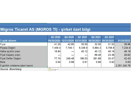 Migros: Yüksek enflasyon ortamında geçen 2021 yılında %32 ciro artışı, %64 oranında faaliyet karı artışı yaşayan Migros’tan 2022 yılı için beklentilerimiz 2021 yılına paralel şekilde. Yine yüksek enflasyonun ana tema olacağı bir yıl beklentimizle, şirketin karlılık adına olumlu bir bilanço çıkaracağını düşünüyoruz.