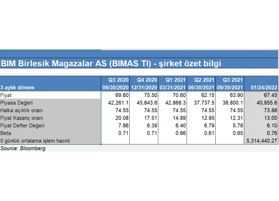 Bimaş, 2021 yılı 9 aylık dönemde şirket %25 oranında ciro artışı, %29 oranında net kar artışı yarattı. Şirket %34 olan enflasyon ortamında, mağaza sayısını artırmaya devam ediyor. Güçlü nakit akışına sahip olan şirket Fas operasyonları, File projesiyle, mağaza sayısını artırmaya devam ediyor. Online platforma da giren şirket, düşük fiyatlama becerisiyle rakiplerine göre rekabet avantajı fırsatına sahip olduğunu söyleyebiliriz.