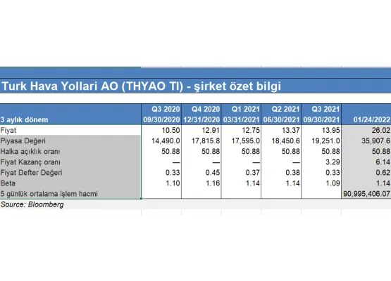 Havacılık sektörü salgından en çok etkilenen sektörlerden biri oldu, nitekim hisse fiyatları da salgın sürecindeki kısıtlamaların etkisiyle oldukça ucuz seviyelere gerilemişti. 2022 yılında aşılanmanın başarısıyla, kısıtlamaların zamanla azalmasını bekliyoruz, özellikle yaz turizminin ülkemiz adına önemli bir gelir kalemi olduğu düşünüldüğünde sektörde canlanma bekliyoruz. TL’deki değer kaybının da etkisiyle yaz turizminde Türkiye, turistlerin yüksek ilgi göstereceği bir konum olacaktır; bu da şirketlerin bilançolarına olumlu katkı yapacaktır.