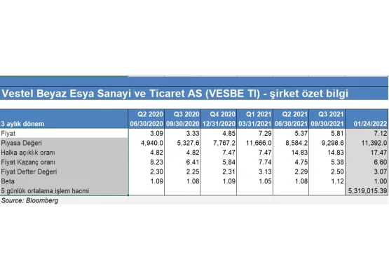 Vestel beyaz eşya: Yükselen kurun etkisiyle 2021/9 aylık dönemde cironun %86 arttığını, net karın ise %56 arttığını görüyoruz. Şirketten oldukça güçlü 2021 yılsonu bilançosu bekleniyor. Yükselen maliyetler ve TL’deki değer kaybı karlılığı azaltsa bile, ihracattaki artış ve fiyat artış yaparak bu dezavantajları giderebiliyor.