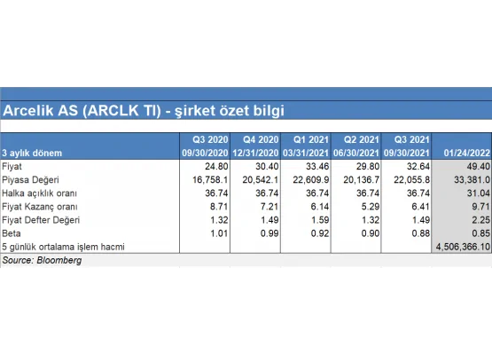 Arçelik: 2022 yılı stratejimize uygun olarak, %70 seviyelerinde ihracat yapan Arçelik şirketini beğeniyoruz. 2021 3. çeyrek itibariyle cirosunda %66’ya yakın bir seviyede yükseliş yaptı, net karında ise %35 seviyesinde bir yükseliş gözlemlendi.