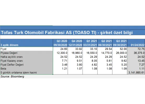 Tofaş Fabrika, güçlü bilançosu ile 2022 yılında iyi performans sergilemesini beklediğimiz şirketlerden bir diğeri. 2021/9 aylık dönem cirosunda %36, FAVÖK performansında %60, net karında %80 oranında artış sağladı. Otomotiv sektöründe zayıf TL’den fayda sağlayan bir diğer şirket olan Tofaş Fabrika, %50 gibi bir oranla güçlü ihracata marjına sahip.