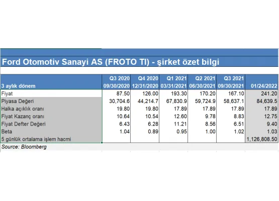 Ford Otosan: Şirketi tercih etme sebeplerimizden bahsetmek gerekirse, öncelikle Türkiye’nin otomotiv üretiminin %25’ini, ticari araç satışının %39’unu, ticari araç üretiminin %74’ünü ve Türkiye’nin ticari araç ihracatının %79'unu karşılar durumda. Şirket, ticari araçlar kategorisinde tüm portföyde 2024 yılına sıfır salınımlı, 2030 yılına kadar ise satışların 2/3’ünün tam elektrikli ya da şarj edilebilir hibrit olmasını öngörüyor. Binek araçlar kategorisinde ise 2026 ortasına kadar tüm portföyde tam elektrikli ya da şarj edilebilir hibrit seçeneklerine sahip olmayı hedeflemekte; yine binek araç kategorisinde 2030 yılına kadar satışların %100’ünün tam elektrikli olması öngörülüyor. 2021 yılı 9 aylık dönemde %60 oranında bir ciro artışı, %107 gibi çok yüksek bir net kar artışı yaşandı, yatırım ve beklentilerin yanı sıra bilanço da oldukça güçlü.