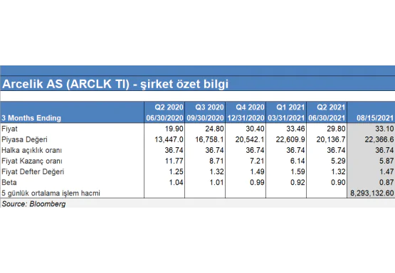 Yılın geri kalanında şirket brüt kar marjını mevcut yüksek seviyeleri koruyabilir ve yeni sipariş alımları ile satışlarını artırabilir. Bu sayede şirketin 2021 yılı için öngördüğü %22 FVAÖK marj artışını sağlayabileceğini düşünüyoruz. Bu nedenle şirket için öncesinde 18 TL olan belirlediğimiz 12 aylık hedef fiyat seviyesini 20.00 TL olarak yukarı yönde güncelleyerek “endeks üzerinde getiri” tavsiyemizi koruyoruz.