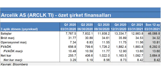 Satışlardaki artışa metal ve plastik başta olmak üzere yükselen hammadde fiyatlarına rağmen şirketin FVAÖK marjı yılın ilk çeyreğinde %14.5 seviyesine yükselmiş. Maliyet artışlarının bir kısmı uzun vadeli anlaşmalar ile bertaraf edilirken güçlü ciro büyümesi ile şirket FVAÖK rakamını 1.884 milyon TL’ye çıkarmayı başarmış. Şirketin operasyonel marjlarının da iyileşmiş olduğu gözden kaçmıyor.