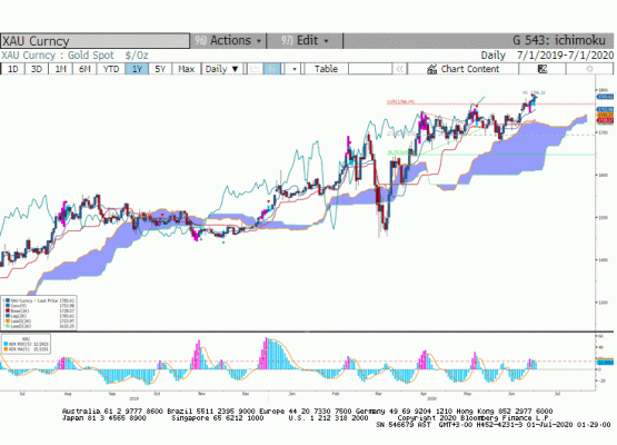 Küresel piyasalarda ikinci dalga beklentileri devam ederken yatırımcı talebi hisse senedi piyasaları ve altına kaymaya devam ediyor. Geçtiğimiz gün 1785$ seviyelerini test eden ons altında yükseliş trendini hala devam ettiğini görüyoruz.