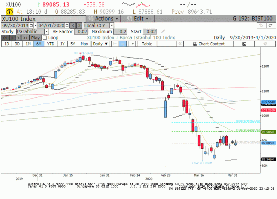 01 Nisan seansında BIST100 endeksi 89.085 seviyesinde 558 puan düşüş ile kapadı. Küresel piyasalar ne zaman sona ereceği bilinmeyen Covid-19 salgın endişesi ile kalıcı bir yükseliş yapamıyor. Aynı durum içeride BIST100 içinde geçerli. Dün endekste ağırlığı yüksek olan bankacılık sektörüne gelen satışlar dikkat çekiciydi. Bankacılık sektöründe likidite ihtiyacının Nisan ayında da devam edeceği beklentisi bu taraftaki satış baskısını artırdı. Sınai ve hizmetler tarafında ise daha pozitif bir fiyatlama vardı. Tekrar edelim 93,500 direnci yukarı yönde kırılmadan endeksin yükseliş denemeleri kısa vadeli olacaktır. Bugün dışarıda küresel hisse senedi piyasasında yaşanacak olası hafif toparlanma içeriye de olumlu yansıyabilir. Buna rağmen bankacılık sektöründeki fiyatlamalarda iyileşme olmadan endeksin yükselişinin kalıcı olmayacağını düşünüyoruz.