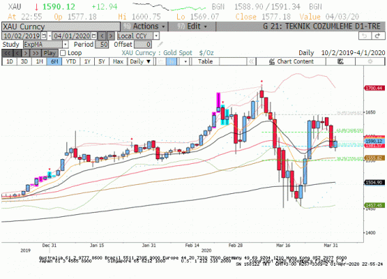 Ons altın dün yayınladığımız raporumuzda bahsettiğimiz gibi bir süreliğine 1550-1610 dolar/ons arasında zaman harcayacak görüntüsü veriyor. Ancak küresel hisse senedi piyasalarında' ikinci sert bir satış dalgası gelmediği ortamda Nisan ayı içinde 1650 direncini test edebilir. 01 Nisan seansında yaşanan harekete biraz daha detaylı baktığımızda 1580 dolar/ons desteğinin çalıştığını gördük. Kapanışın bu seviye üzerinde gerçekleşmesi olumluydu. Bugün de 1590 dolar/ons üzerinde kalınabilirse kısa vadede 1608 dolar direnci denenebilir.