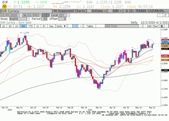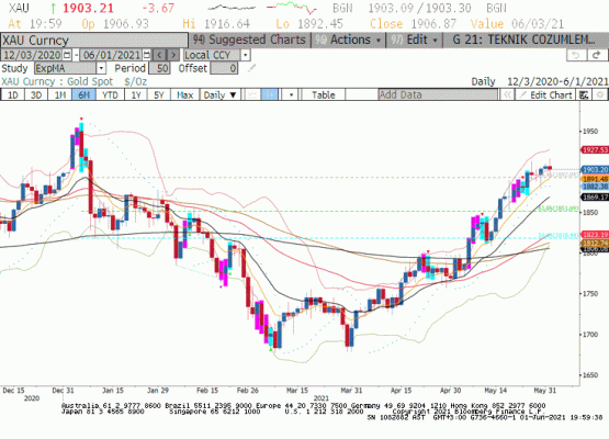 01 Haziran seansında en yüksek 1916 seviyesini gören ons altın arada 1892 seviyesini geriledi buna rağmen 1900 dolar üzerinde kapanış yaptı. Son sekiz haftanın yedisinde yükseliş ile kapatan ve bu dönemde 160 dolar yükselen ons altın kısa vadede 1915 dolar üzerine yerleşmekte zorlanıyor. Küresel risk iştahı ve Dolar Endeksinde geri çekilme altın pozitif olsa da FED toplantısı yaklaştıkça tahvil bono piyasasında faiz oranları yükselebilir. Bu durum kısa vadede altın için negatif 1892 dolar altında kapanış durumunda 1880 dolara doğru geri çekilme sürebilir. Öte yanda 50-100-200 günlük orta vadeli haraketli ortalamalar ile yükseliş trendi sürerken Cuma günü açıklanacak tarım dışı istihdam verisi ve 16 Haziran FED toplantısı ile altın son 7 haftada kat ettiği yolu bir süre sindirmek isteyebilir. Bu dönemde 1900 dolar üzerinde kapanışlar ile çabuk toparlanma mümkün iken 1900 dolar altında kapanışlar altın EFT’lerine ilgiyi azaltabilir.