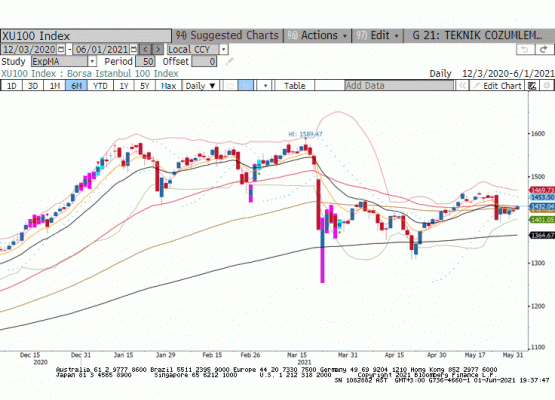 01 Haziran seansına kararsız başlayan BIST100 endeksi bankacılık ve kimya, kâğıt ve ambalaj ile demir çelik sektörü içindeki hisse senetlerinden aldığı destek ile 11 puan yükseliş ile 1432 seviyesinde kapanış yaptı. Küresel hisse senedi piyasalarında Asya’dan başlayan iyimserlik devam ederken 28 Mayıs haftasında ABD’de işlem gören gelişen ülke EFT’lerine (borsa yatırım fonu) art arda 30. Haftada girişlerin devam ettiğini gördük. Geçtiğimiz hafta ABD’de işlem gören EFT’lere 1.74 milyar dolar giriş gerçekleşti. Detayda hisse senedi yatırım fonlarında girişin 1.74 milyar dolar olduğu görüldü. En fazla giriş alam gelişen piyasalar Çin ve Hong Kong olurken Türkiye tarafında bono EFT’lerine 8.5 milyon dolar giriş olduğunu hisse senedi EFT’lerinden ise 0.4 milyon dolarlık çıkış olduğu açıklandı. Gelişen ülke hisse senedi piyasalarına ilginin devam ettiği ortamda Türkiye’ye yabancı ilgisinin zayıf olduğunu ve BIST100 endeksinin performansının büyük ölçüde içeride yerli yatırımcıya bağlı olduğunu söyleyebiliriz. 2021 yılı başından bu yana yapılan halka arzlara olan ilgi bu dönemde BIST100 endeksinde yükseliş potansiyelini sınırladı. Çünkü bu halka arzlara talep yeni yatırımcılardan ziyade mevcut yatırımcı ile gerçekleştiğinden artan işlem hacmi ile yükseliş mümkün olmuyor.