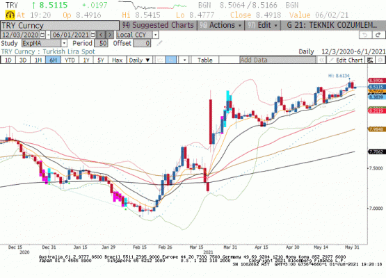 Dışarıda Dolar Endeksi (DXY) 89.75 seviyesine doğru geri çekilirken TL’nin ABD Doları karşısında değer kazanmakta zorlandığı bir gün geride kaldı. Türkiye 10 yıllık tahvil faiz oranı %18.59 seviyesinde kapanış yaptı. 5 yıllık CDS primi 408 civarında işlem görürken opsiyon piyasasında Dolar/TL paritesinde aylık zımni volatilite 16.21 seviyesine geriledi. Oynaklık düşerken Dolar/TL paritesinin aynı etki ile 8.4000 seviyesine doğru geri çekilmekten imtina ettiği görülüyor. Dün açıklanan Mayıs ayı PMI imalat sanayi endeksi 49.3 (önceki 50.4) olarak gerçekleşti. Bugün Türkiye tarafında açıklanacak önemli bir veri bulunmaz iken parite Perşembe günü açıklanacak enflasyon verisini bekliyor. Bloomberg terminaline yansıyan ortalama beklentiler göre Mayıs ayında Tüfe %1.32 artış ile %17.25 seviyesine yükselebilir. Mayıs ayında covid-19 ile mücadele kapsamında kapalı olunan günlerde enflasyonist baskısının önceki aylara kıyasla azalma ihtimali olduğunu düşünüyoruz. En kötü senaryoda mevcut durum korunabilir. 24 gelişen ülke para biriminin son beş gündeki sıralamasına baktığımızda Brezilya Reali %3.26 kazanç ile başı çekerken TL’nin değer kaybı %0.62 olarak görülüyor. Emtia paralarının göreceli iyi performansı şaşırtıcı değil ancak TL’nin de üzerindeki stresi atıp bu kervana katılma ihtimalini göz ardı etmiyoruz. Ancak dün Sn. Cumhurbaşkanı'nın faizlerin düşmesi gerektiği yönünde açıklamalar ile güne yükseliş ile başlayan Dolar/TL paritesi erken faiz indirimi endişesi ile yükseliş eğilimini sürdürebilir.