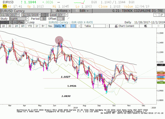ECB Başkanı Lagarde'ın dün güvercin sayılabilecek açıklamalarına rağmen parite yükseliş kaydetti. Euro bölgesinde büyümenin zayıf seyrettiğine vurgu yapan Lagarde destekleyici politikaların devam edeceğini belirtti ancak ilave teşvik düşünmediklerini belirtti. Piyasa muhtemelen teşviklerin devamı olmayacağı yönündeki algılamayı Euro pozitif yorumladı ve dün de belirttiğimiz gibi zaten 1.10 seviyesinde çift dip oluşumu gösteren parite yükseldi. Ayrıca ISM imalat PMI'ın gerilemesi de paritede alımları destekleyen bir gelişmeydi.