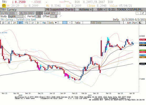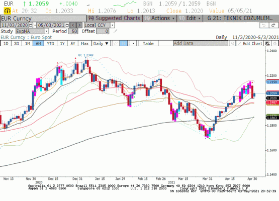 Dün açıklanan Nisan ayı PMI imalat sanayi son okumada İsviçre ve İspanya dışında ufak tefek güncellemeler olduğunu gördük. İsviçre PMI imalat sanayi endeksi 69.5 olarak yukarı yönde güncellenirken İspanya PMI imalat sanayi endeksi 57.7 olarak 59.1’den aşağı doğru güncellendi. Geçtiğimiz haftanın son işlem gününde alınan ilk çeyrek büyüme rakamları ile bölgede yılın ilk çeyreğinde ekonomik zayıflama aşikâr; Bu tabloda Euro/dolar paritesinde yükselişin devamı büyük ölçüde Dolar Endeksine bağlı görülüyor. Dünkü raporumuzda devasa teşvik paketleri ve piyasada reflasyon fiyatlaması ile Dolar Endeksinde yükselişin kalıcı olmayacağı görüşüne yer vermiştik. Dünkü seansta bu görüşümüze istinaden Dolar Endeksi 91.30 endeks seviyesi üzerinde kalmakta zorlandı. Ancak bu hafta küresel piyasalarda risk alma eğilimi zayıflar ise durum değişebilir. Kısaca Euro/dolar paritesinin geçtiğimiz haftanın yüksek seviyeleri üzerine çıkması büyük ölçüde ABD Doları ile belli olacaktır.