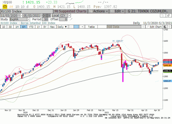 Küresel hisse senedi piyasaları geçtiğimiz hafta gösterdiği isteksiz fiyatlamaları bir kenara bırakıp haftaya olumlu başlama eğiliminde iken ABD’de işlem gören gelişen ülke ETF’lerine 26. Haftada girişlerin devam ettiğini görüyoruz. 30 Nisan haftasında gelişen ülke ETF’lerine giriş 341.7 milyon dolar olarak gerçekleşmiş. Bu dönemde Türkiye ETF’lerine 15.3 milyon dolar hisse 6.8 milyon dolar bono olmak üzere toplamda 22.1 milyon dolar giriş olduğunu görüyoruz. BIST100 endeksine gelince haftaya 1400 endeks seviyesi üzerinde başlangıç yapmış olmayı pozitif değerlendiriyoruz. Geçtiğimiz hafta boyunca büyük piyasa değerli hisse senetlerinin bilançolarında çoğunluğun beklenti üzerinde gerçekleşmesi olumluydu. Bu hafta içinde de açıklanacak ilk çeyrek bilançoları ile hisse bazında hareketin devam edebileceğini düşünüyoruz. Endeks içinde sektör performanslarının dağılımına göre Bilgi Teknolojileri, Enerji, Sanayi ve Gayrimenkul sektörü yükselişte başı çekerken bu hafta bankacılık ve servis sektörü hisse senetlerine ilgi olması durumunda BIST100 endeksi 1460 endeks seviyesine doğru yükselişini sürdürebilir.
