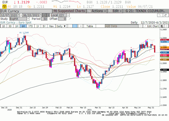 1.2250 seviyesini yukarı yönde kırmakta zorlanan Euro/dolar paritesi 03 Haziran seansında 18 günlük üssel haraketli ortalaması olan 1.2175 seviyesine doğru geri çekildi. Avrupa Bölgesinde dün açıklanan Markit PMI Bileşik endeksi 57.1 servis sektör endeksi 55.2 olarak piyasa beklentisi üzerinde ve olumlu gerçekleşti. Avrupa tarafında PMI imalat ve servis sektörü para birimi için pozitifti. Ancak arada FED üyesi Parker’ın FED ’in önümüzdeki toplantılarda varlık alımlarını tartışması gerektiği yönünde açıklaması ve öğleden sonra açıklanan ABD ekonomik verilerinde pozitif gerçekleşmesi sonrası Euro/dolar paritesi havlu attı. Opsiyon piyasasında Haziran vade kontratları bugün itibari ile sona eriyor. Dün istihdam piyasasına ilişkin olumlu ekonomik veriler ile bugün gözler tarım dışı istihdam verisine çevrildi. Teknik olarak, 18 günlük üssel haraketli ortalama 1.2170 altında kapanış ile görünümün bozulduğunu ve Euro/dolar paritesinin 16 Haziran FED toplantısını geride bırakıncaya dek yukarı yönlü eğilim için zorlanacağını düşünüyoruz.