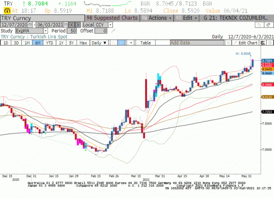 Dün açıklanan ekonomik verilerde Mayıs ayı tüketici fiyat endeksi %0.89 artış ile %16.59 seviyesine gerilerken Yurt İçi ÜFE aylık %3.92 yükselerek %38.33 olarak gerçekleşti. Mayıs ayının büyük kısmını kapsayan kapalılık giyim ayakkabı gibi ürün gruplarında talebin azaldığını gösteriyor. Yaz aylarına girerken gıda fiyatlarında hafif geri çekilmenin de enflasyonu aşağı çektiğini görüyoruz. Öte yanda aylık bazda manşet enflasyonun beklentilerin altında kalması pozitif olmakla birlikte yaz aylarını kapsayan iyileşme görmeden piyasalar olumlu fiyatlama için zorlanıyor. Enflasyon verisi sonrasında 2 yıllık tahvil faiz oranları %18.90 ve 10 yıllık tahvil faiz oranı ile %18.91 seviyesinde kapanış yaptı. 5 yıllık ülke risk primi 410 opsiyon piyasasında Dolar/TL paritesinde 3 aylık öngörülen volatilite %18.63 seviyesinde oluştu. Gün boyunca dar bir aralık içinde işlem gören Dolar/TL paritesi enflasyon verisinde görülen düşük seviye 8.5894 oldu. TÜFE’nin beklenti altında gerçekleşmiş olması Temmuz ve Ağustos aylarında TCMB politika faizini indirebilir imajı ile TL başta olmak üzere piyasa fiyatlamalarına olumlu yansımadı. Öğleden sonra ABD haftalık işsizlik başvuruları, ADP özel sektör istihdam rakamı ve Markit PMI imalat sanayi endeksinde iyileşme sonrası Dolar Endeksi 90.50 seviyesine yükseldi. FED üyelerinden Parker’ın FED’in varlık alımlarını azaltmayı tartışmak gerektiği yönündeki açıklaması iyi ekonomik veriler ile birleşince küresel piyasaların risk alma eğiliminin düştüğünü gördük. Gün boyunca 8.6000 üzerinde sınırlı yukarı giden Dolar/TL paritesi ABD verileri sonrasında 8.7188 seviyesini gördü. Günün yüksek seviyelerine yakın kapanış ile paritenin 8.5500 üzerinde kaldığı ortamda yükseliş eğilimi sürüyor.