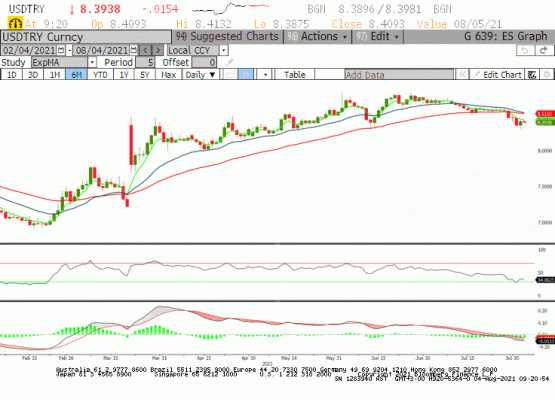 Teknik olarak incelediğimizde 8.30 seviyelerinde oldukça güçlü bir desteğin bulunduğunu görüyoruz. Bu seviyelere doğru bir hareket izlenimi hakimken bu seviyelerden nasıl tepki verileceği ise TL açısından gidişatı belli edecektir. Bu seviyeler aşılırsa ilk etapta 8.10 seviyelerine kadar bir geri çekilme yaşanabilir ve sonrasında ise 8 TL psikolojik sınırı test edilebilir.