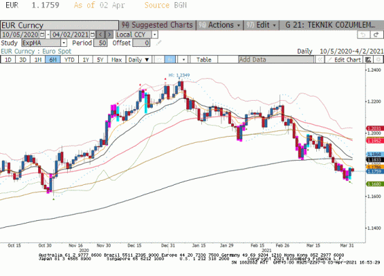 Bu hafta IMF ve Dünya Bankası toplantısı ve ekonomik göstergelerde güncelleme takip edilecek. Euro Bölgesinde Şubat ayı işsizlik oranı dışında (%8,1) servis sektör endeksi verilerinde son okumalar takvimde yer alıyor. Bu hafta FED Mart ayı toplantı tutanakları, Powell'ın IMF seminerinde Perşembe günü yapacağı konuşma ve güçlü Mart ayı sitihdam verisi ile genel beklenti ABD Doları'nın güçlü seyrini koruyacağı yönünde. Öte yanda Avrupa'da artan covid-19 vaka sayısı ve devam eden kısıtlamalar ile euro/dolar paritesinde yükselişin 200 günlük üssel hareketli ortalama 1.1835 üzerine çıklılmadıkça kısa vadeli olduğunu söyleyebilriz.