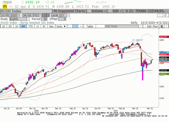 01 Nisan senasında bankacılık sektörüne gelen alımlardan destek bulan ve haftanın son işlem gününde 100 günlük üssel hareketli ortalaması olan 1435'i test eden BIST100 endeksinde kapanış 1430 olarak gerçekleşti. Veri ekranlarına düşen haber akışına göre hükümet kurumlar versisi oranını 2021'de %25'e çekmek için hazırlanıyor. Kurumsal vergi oranının 2023 senesi için ise %23 olarak planlandığı beklentisi var. Hisse senedi piyasasını yakından ilgilendirecek bu gelişme piyasada önümüzdeki iki yılın karlılık baklentilerinin değişmesi anlamına geliyor. Öte yanda sınai sektörü içinde hisse bazında pozitif etki yaratan haber akışı ile pozitif olmakla beraber piyasanın moralini düzeltecek olan bankacılık sektöründe ki toparlanma olacaktır. Son beş işlem gününde sınai sektörü 132 puan hizmetler 30 bankacılık 26 puan yükseliş kaydetti. Bugün ve haftanın geri kalanında BIST100 endeksinin küresel risk alam eğilimine iştirak etmesi Ankara'dan gelmesi muhtemel haber akışına ve bankacılık sektörü performasnına bağlı diyebilriz.