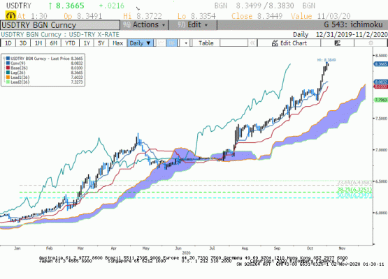 USD/TRY paritesi geçtiğimiz gün, gün içinde 8,4130 ile 8,4827 bandında hareket ettikten sonra akşam saatlerinde 8,4232 seviyesinden dengelendi. ABD seçim sonuçları öncesi dolar gelişmiş para birimleri karşısında gerileme gösterirken dolar/TL de gün içinde gevşedi. Gün içinde Biden'ın kazanma ihtimalinin artması dolar endeksinde gerilemeye yol açarken paritede gevsemenin nedeni de bu oldu. Diğer yandan Fed, beklentilere paralel olarak federal fonlama faizinde değişikliğe gitmedi. Toplantı sonrasında açıklamalarda bulunan Fed Başkanı Powell, son zamanlardaki koronavirüs vakalarındaki artışın endişe verici olduğunu belirtti.