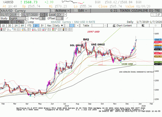 Teknik olarak bir önceki zirve 1557 usd ve daha aşağıda 1535 usd seviyesi önemli destekler. Dün görülen ters çekiç formasyonu ve momentum eğrilerinin aşırı alım bölgesinden çıkma eğilimi göstermesi yani piyasanın güç kaybetmesi ile tepki satışı devam edebilir ve bir süre konsolidasyon eğilimi izlenebilir. Ancak trendin hala kuvvetli biçimde yukarı yönlü olduğuna dikkat edilmelidir. 1600 usd seviyesi psikolojik bir direnç olarak bu anlamda takip edilebilir.