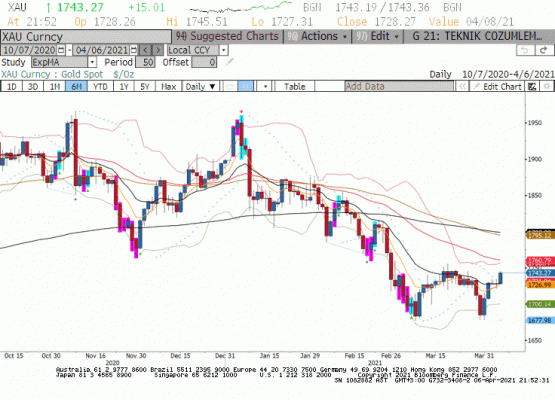 Tahvil getirileri ve Dolar Endeksinde düşüş ile ons altın geçtiğimiz hafta 1675 seviyesini gördükten sonra yükselişe geçti. 2020 senesine benzer oynaklık artışı ile gelen güçlü bir yükseliş olduğunu söyleyemeyiz. Ancak fiyatların kısa vadede 1700 dolar/ons üzerine yerleşmesi ile etf borsa yatırım fonlarına ilgi artabilir. Ekonomik iyileşme ve IMF'in öngörüsüne göre enflasyonda küresel çapta artması muhtemel oynaklık altına destek verebilir. Teknik olarak, 50 günlük üssel hareketli ortalaması olan 1760 dolar önümüzdeki günlerde mıknatıs görevi görebilir.