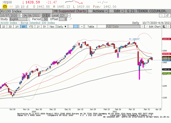 06 Nisan seansında BIST100 endeksi %1,49'luk geri çekilme ile karşılaştırma grubu içerisinde yer alan gelişen ülke piyasalarına kıyasla zayıf performans gösterdi. Satılşarın arkasında yatan sebeplere gelince derecelendirme kuruluşu Fitch'in son dönemde piyasada artan oynaklık ve TL'in değer kaybı ile bankacılık sektörünün refinansman riskinin arttığı yönündeki açıklamasıydı. Bunun yanında Avrupa Birliği ile ileriye dönük ilişkilerde normalleşmenin zaman alacağını işaret eden açıklamaların da BIST100 endeksine gelen satışlarda etkili oldu. AB Türkiye ile ilişkilerde ilerleme için İnsan hakları ve modernize sendikalaşmayı şart koşuyor. Öte yanda artan covid-19 vaka sayısınında yatırımcı nezdinde moral bozduğunu söyleyebilriz. Sonuç olarak günün yüksek seviyesi 1445 ardından kapanış 1420,59 olarak gerçekleşti. Bu hafta 1400-1445 aralığının kırılma yönü yatırımcı nezdinde takip edilebilr.