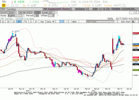 Dışarıda Dolar Endeksi 92,400 seviyesine doğru geri çekilirken TL son beş işlem gününde ABD Doları karşısında %2,36 değer kazandı. Ancak sene başından bu yana performansa bakıldığında TL'in ABD Doları karşısında değer kaybının %8,65 olduğunu görüyoruz. Kısaca son beş günlük değer kazanımına rağmen sene başından bu yana performans tatmin edici görülmüyor. 06 Nisan seansında 8.1000-8.1700 dara aralığında işlem gören Dolar/TL paritesinin kısa dönem yön tayininde zorlandığı anlaşılıyor. Reel efektif kur endeksi Şubat ayında 69.45'ten Mart ayında 65.71 seviyesine geriledi. TCMB Mart ayı enflasyon raporunda manşet enflasyondaki artışın Üretici fiyat endeksi ve emtia fiyatlarında artış kaynaklı olduğunu belirtti. Banka detayda sevis sektörü kaynaklı fiyat artışlarına dikkat çekerken gıda fiyatlarının enflasyonist etkisinin zayıfladığını işaret etti. Dolar/TL paritesinin 15 Nisan PPK toplantısına kadar 8.0000 TL altına yerleşmekte zorlanacağını toplantı sonrasında orta vadeli yön tayini konusunda karar vereceğini düşünüyoruz.