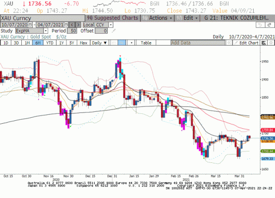 Ons altın fiyatları 1745 dolar seviyesini geçmekte zorlanıyor. Kapanış kısa vadeli üssel hareketli ortalama 1734 dolar üzerinde gerçekleşti. DXY da yaşanan 92,50 yükselişi altında yukarı yönlü hareketin önünü kesti. Altın fiyatları bugün 1730 dolar/ons üzerinde kalabilirse 50 günlük üssel hareketli ortalama 1760 seviyesi hedef olabilir. Öte yanda oynaklığın ons altın fiyatlarını 1760 dolara taşıyacak güçte olmadığını söyleyebilriz. Kısa vadede 1730-1745 aralığının kırılma yönü zamana yayılan hareket için gösterge olabilir.