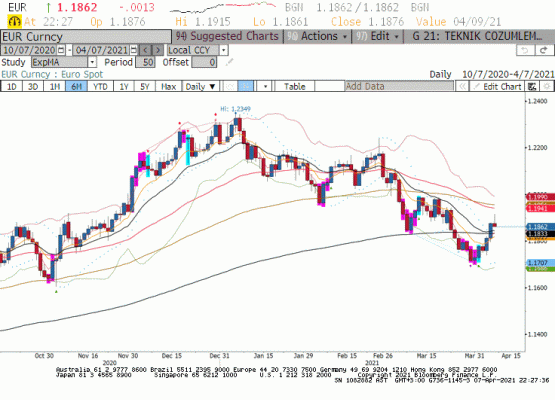 Dün 1,1917 seviyesine kadar yükselen euro/dolar paritesinde kapanış 1.1870 civarında geri çekilme ile oldu. DXY tekrar 92.50 seviyesine yükseldi. Gün içinde aşılama süreci ve covid vaka sayısı ile FED toplantı tutanakları dahil dolar pozitif. ECB üyelerinden gelen açıklamalar bakılırsa yılım 3. çeyreğinde Merkez Bankası varlık alımlarını kademeli olarak azaltabilir. Bir tarafta enflasyondaki görünüm diğer yanda ekonomik iyileşmeye yönelik gecikme ihtimali ile çıkış açıklamalarının erken olduğunu düşünüyoruz. Döviz piyasası da böyle düşünüyor olmalı ki Euroda yükselişin devamı gelmedi.