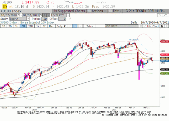 07 Nisan seansında 1402 düşük seviyesinden yaşanan toparlanma ve 1417,89 kapanışı kısmen olumlu iken 5 ve 6 Nisan tarihlerinde test edilen 1445 geçilemiyor. İki hafta önce yaşanan sert satış dalgası ardından içeride hisse senedi piyasasına ilginin azaldığını görüyoruz. Halka arzlar ve halka arz haberleri olan hisse senetleri dışında piyasayı direnç seviyelerine sürükleme potansiyelinde olan hisse senetleri dışarıdan satış alıyor. Bu tabloda kısa vadede en iyi senaryoda 1445 üzerinde kapanışlar ile 1470 sonrasında 1495 seviyesine yükseliş olabilir. Aşağıda 1440 altında kapanışlar piyasanın tekrar satıcıların kontrolüne geçtiği anlamına geliyor.