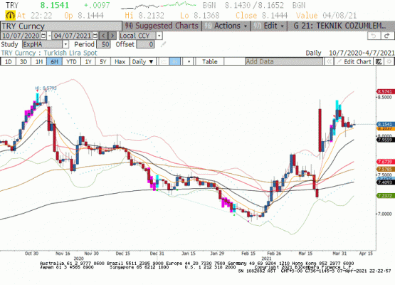8,1300-8,2100 arasında işlem gören Dolar/TL'de kapanış 8,1500 üzerinde gerçekleşti. Dün açıklanan Mart ayı FED toplantı tutanaklarına göre banka enflasyonun endişe kaynağı olması için zaman gerektiğini düşünüyor. Yine geçtiğimiz toplantılara benzer varlık alımlarını azaltmak için erken. Banka bu görüşü yanında teşvik paketi ve aşılama sürecinin ekonomi pozitif etkisine dair iyimser olduğunu söylüyor. Dışarıda ABD ekonomisine ilişkin olumlu beklentiler sürerken Dolar Endeksi 92,137 düşük seviyesi ardından günü 92,500 sınırında kapattı. Dün açıklanan ekonmik verilerde Mart ayı nakit bütöe dengesi 41,0 mia dolar olarak pozitif. Bugün her Perşembe olduğu haftalık yabancı portföy istatistikleri açıklanacak. TL ve cinsi varlıklardaki sakin seyre bakarak bu haftaki verilerde yabancı portföy çıkışlarının ivme kaybettiğini görebiliriz. 15 Mayıs PPK toplantısına kadar Dolar/TL paritesinde 8,0000 TL altında fiyatlama olsa da kalıcı olmayacağını döviz piyasasının PPK toplantısını beklediğini söyleyebiliriz.