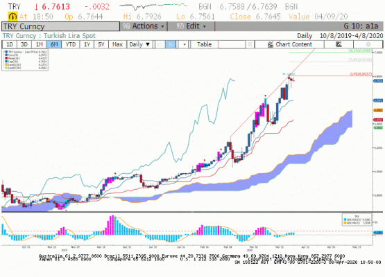 Dolar/TL paritesinde dün görülen yüksek seviye 6.7926 iken hareket alanı dardı. IMF'in gelişen ülkelere dolar likiditesi için swap limiti açacağı haberleri Türkiye için gerçeğe dönüşürse kısa vadeli olmakla beraber TL değer kazanabilir. Aksi durumda gelişen ülkeler arasında sürüden ayrılan imaj ile TL'deki satış baskısının artması beklenebilir. Türkiye 5 yıllık CDS primi 620.000 ile yüksek seviyesini koruyor. USDTRY paritesinde 3 aylık zimni volatilite 24 ile rekor seviyede; kısaca TL'deki satış baskısı devam ediyor. Dün ivme kaybeden yükseliş eğilimine rağmen bellirgin bir geri çekilme için henüz teyit alamıyoruz.