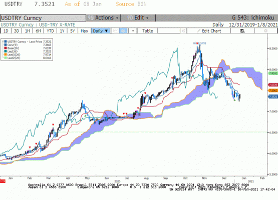 USD/TRY paritesi geçtiğimiz gün, gün içinde 7,3045 ile 7,4194 bandında hareket ettikten sonra akşam saatlerinde 7,3762 seviyesinde dengelendi. Hafta genelinde ABD'de yaşanan karmaşa sonrası hafta sonuna doğru DXY'de yükselişin yaşanması paritede 7,24 seviyelerinden destek bulunarak yeniden yükselişe neden olurken, geçtiğimiz hafta da dolarizasyonun hala devam ettiğini ve yurt içi yerleşiklerin geri çekilmeleri hala alım fırsatı olarak gördüklerini gördük.