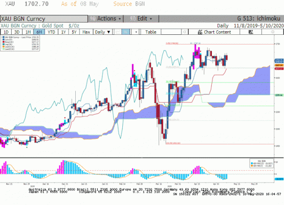 08 Mayıs seansında bir önceki gün yaşanan yükseliş ardından ons altının sakin bir gün ardından kapanışa doğru gelen satışlar ile günün düşük seviyelerine yakın kapanış yaptığı görüldü. 1.699-1.723 günün düşük ve yüksek seviyeleri iken kapanış 1702.70 dolar/ons olarak gerçekleşti. Dolar Endeksi 100 endeks seviyesi altında iken ileriye dönük FED'in negatif faiz politikası ihtimali altında sert satışların önüne geçiyor. Öte yanda haftanın son işlem gününde ileriye dönük negatif faiz beklentisine rağmen 10 yıllık ve 30 yıllık tahvil faiz oranlarında iyimserlik altında yükselişin önüne geçti.
